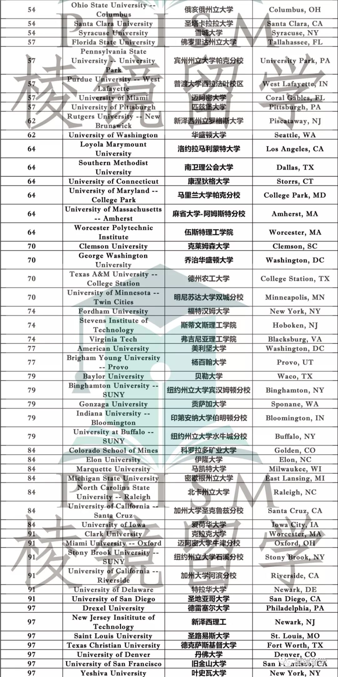50-100名的学校里,值得注意的是,上升最快的是匹兹堡大学和佛州州立大学,由70上升到57。下降最快的是克拉克大学,由66下降到91。为了保证大学都排在前100,官方也是够努力了,有7所大学并列84,6所并列91,还有并列97的有7所大学。