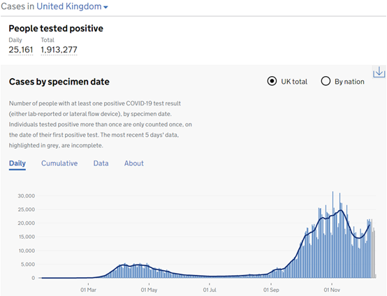 根据英国政府公布的数据,截止至当地时间12月16日,英国一共有1,913,277人确诊,当日确诊人数为25,161人。总体来说,目前12月份的单日确诊人数相较11月份的略有缓和。