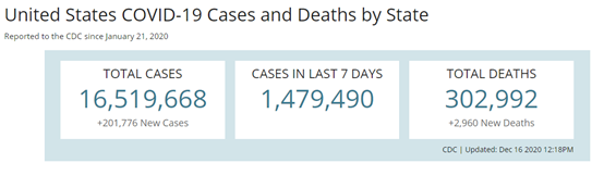 从确诊人数来看美国可以说是世界上疫情最严重的国家了。根据美国疾控中心发布的数据,截止至当地时间12月16日,美国一共有16,519,668人确诊,最近7日确诊人数为1,479,490人。目前疫情最严重的地区是加利佛尼亚州以及德克萨斯州,全美单日确诊人数还未见明显下降。